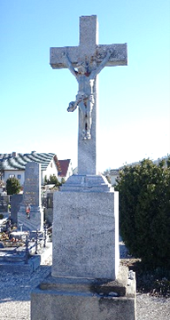 Das Kreuz aus Wachauer Marmor steht auf einer quadratischen Fundamentplatte mit einem aufgesetzten, niedrigen gestockten Sockel, auf dem ein schmälerer hoher glatter Sockel die Basis für das Steinkreuz bildet. Auch der Korpus des Gekreuzigten in der 4-Nagel Technik ist aus Wachauer Marmor gefertigt. Auf dem hohen Sockel befindet sich die Inschrift: